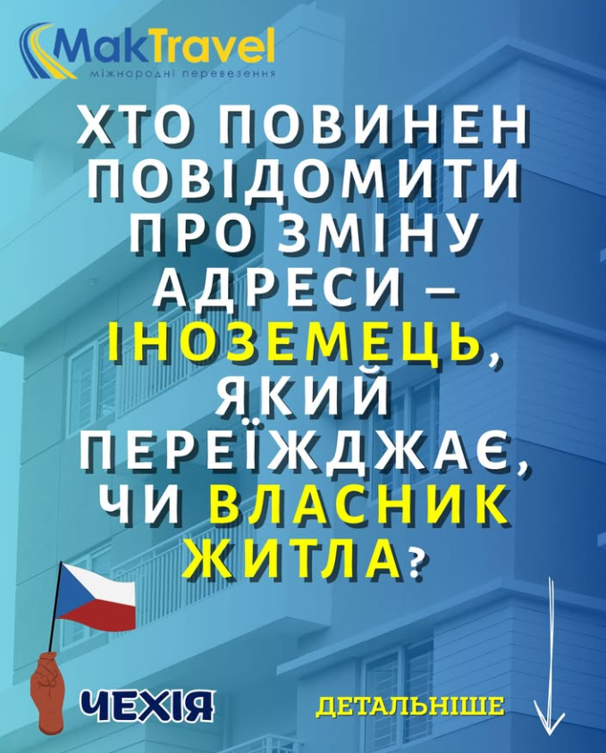 ⛔ Власник житла має окремий обов’язок — повідомити про проживання іноземців поліцію у справах іноземців (cizinecká policie). Він теж повинен зробити це протягом трьох робочих днів. Це окрема дія, яка не звільняє іноземця від обов’язку самостійно повідомити МВС про зміну адреси.